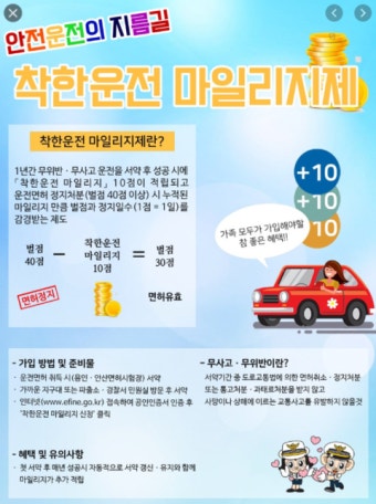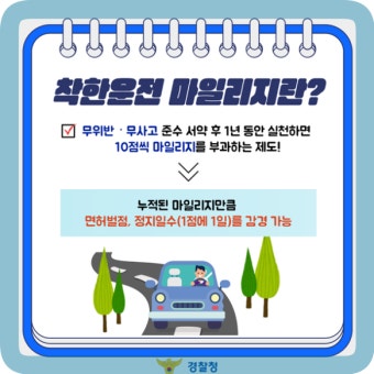 착한운전 마일리지는 교통법규를 1년간 성실히 지킨 운전자에게 마일리지를 적립해 주는 경찰청 제도입니다.