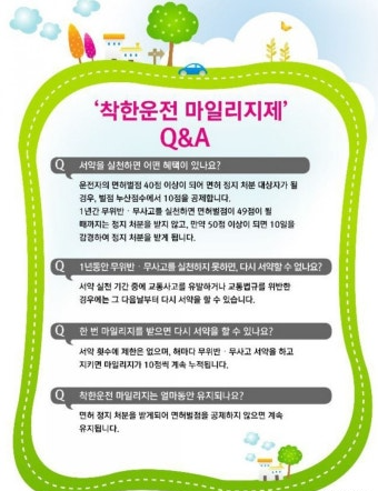 A1. 운전면허를 소지한 누구나 신청 가능합니다. 단, 서약 이후 1년간 무위반·무사고를 실천해야 마일리지가 적립됩니다.